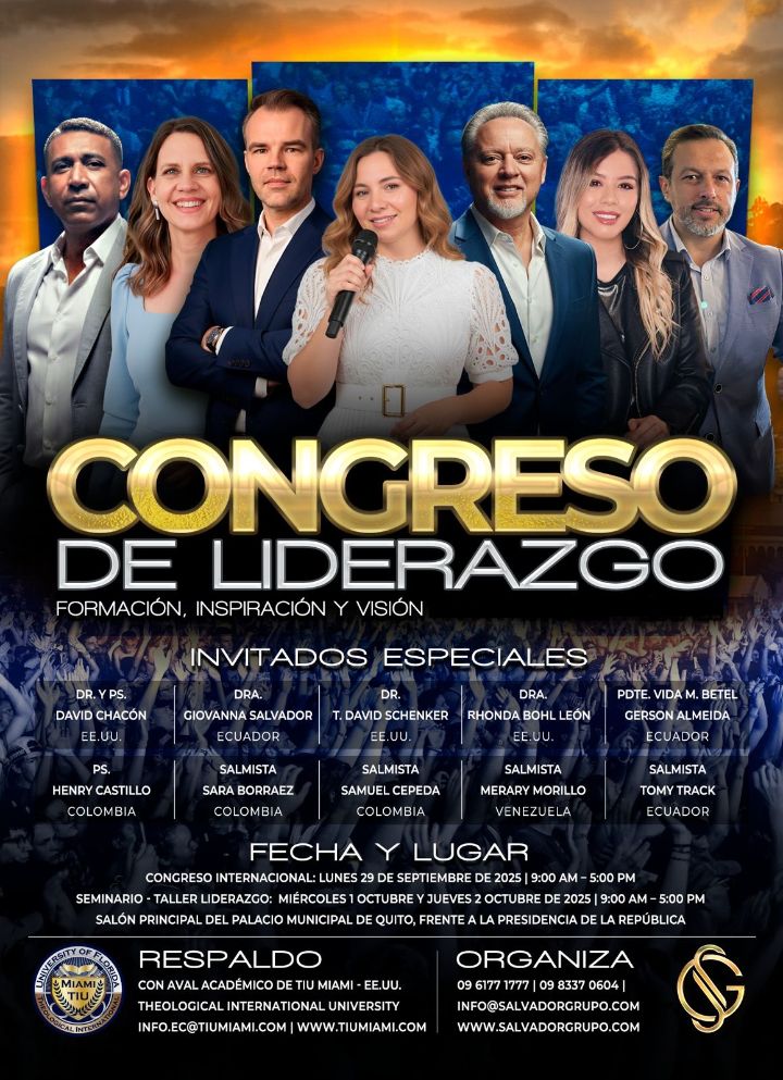 Congreso de Liderazgo Internacional Una honra que trasciende 3 días extraordinarios: Lunes 29 septiembre Miércoles 1 octubre Jueves 2 octubre Horario diario establecido de: 09h00 – 17h00 (9 am - 5 pm) Salón Principal del Palacio Municipal de Quito Sector Plaza Independencia Frente a Presidencia de la República Adquiere el Diploma en Liderazgo con aval de la prestigiosa Universidad Internacional TIU, un sello de excelencia para tu hoja de vida. Emisión Diploma: $ 55 USD Invitados especiales de EE.UU., Ecuador, Colombia, Perú y Venezuela. Reserva tu cupo, o regístrate al ingreso, plazas limitadas. 0961771777 / 0983370604 www.salvadorgrupo.com Mayor información: https://oneclic.app/4168/Curso+de+Liderazgo.htmlu