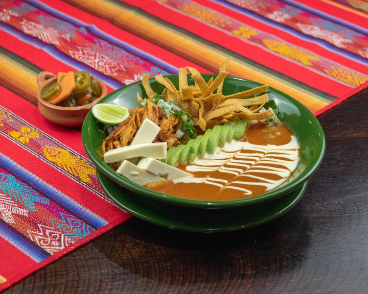 Deliciosa sopa de tomate y vegetales tatemados acompañado de pollo picado, tortillas cortadas artesanales, aguacate y queso.