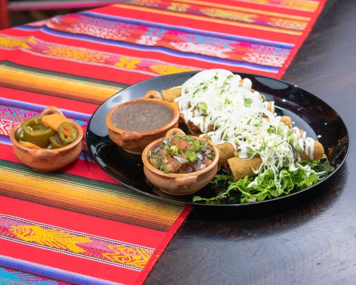 Deliciosas tortillas de maíz fritas rellenas de (carne picada, cochinita o pastor) acompañado de ensalada, guacamole y pico de gallo.