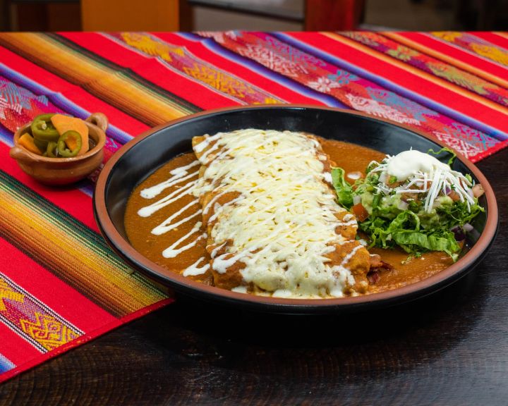 Tortillas de maíz rellenas de puré de frijoles y proteína a tu elección (carne picada, costilla de res, pollo, cochinita y chorizo) bañada de nuestra salsa de jitomates gratinadas con queso mozzarella y acompañada de ensalada de la casa.
