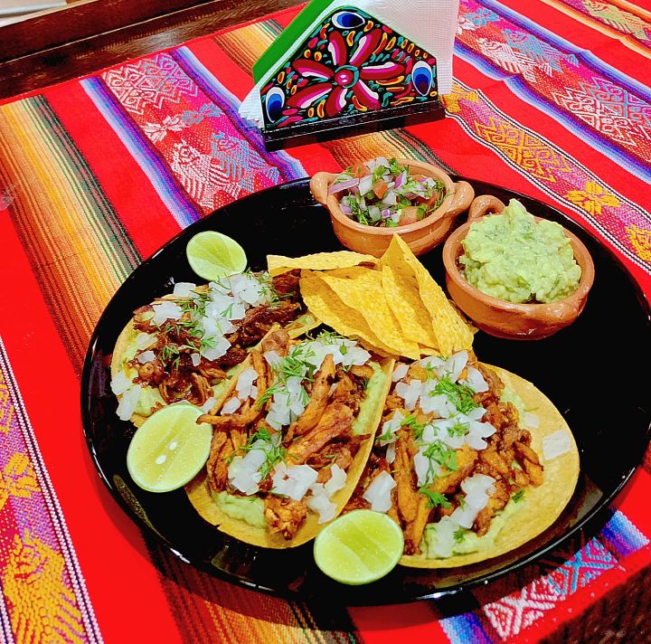 Tortillas de maíz artesanales, acompañada de su proteína (carne picada, costilla de res, pollo, cochinita, pastor o chorizo) y sus guarniciones, puré de frijoles, guacamole, totopos y pico de gallo.