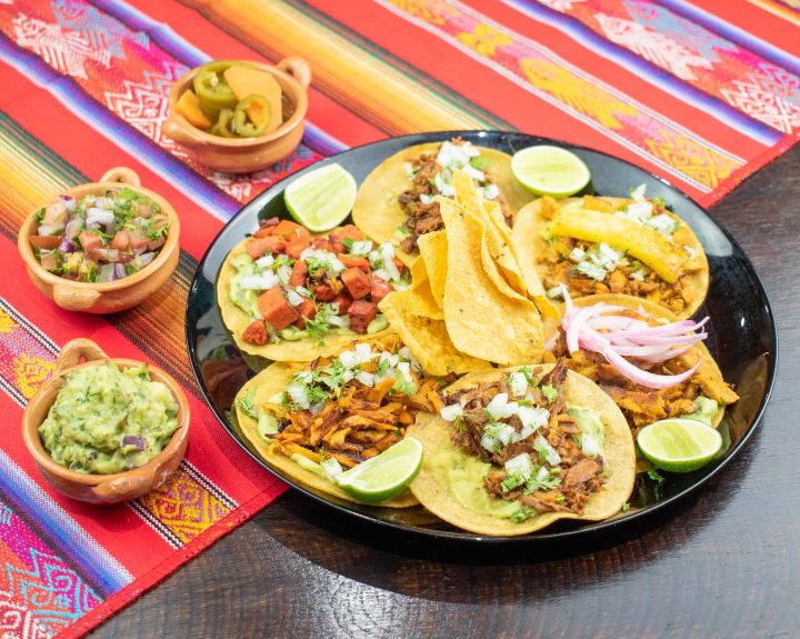 Tortillas de maíz artesanales, acompañada de su proteína (carne picada, costilla de res, pollo, cochinita, pastor o chorizo) y sus guarniciones, puré de frijoles, guacamole, totopos y pico de gallo.